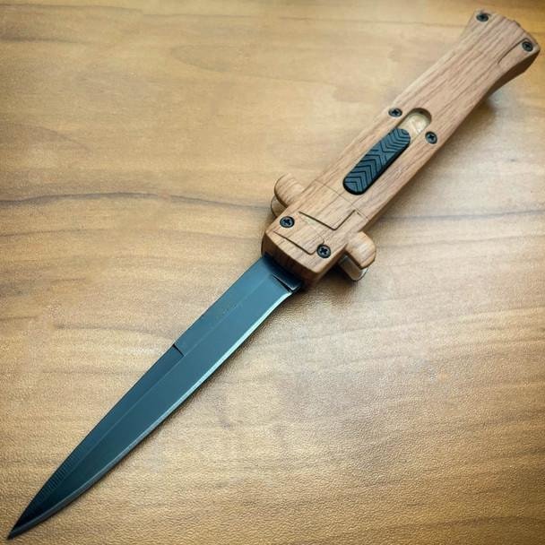 This Italian-style 9-inch OTF model features a satin-finished single-edge blade and a nylon fiber handle.