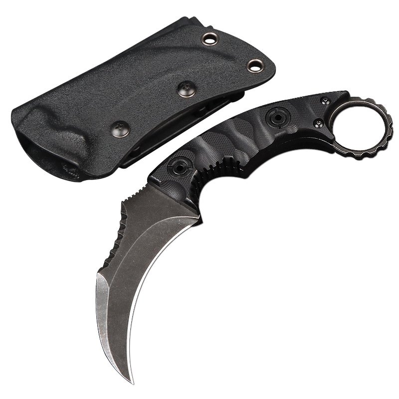 This Karambit Knife is a versatile high-performance blade designed for camping, survival, self-defense, and outdoor adventures. Crafted from premium D2 steel, it boasts exceptional hardness and durability. The integrated design ensures sharpness and reliability for various tasks.