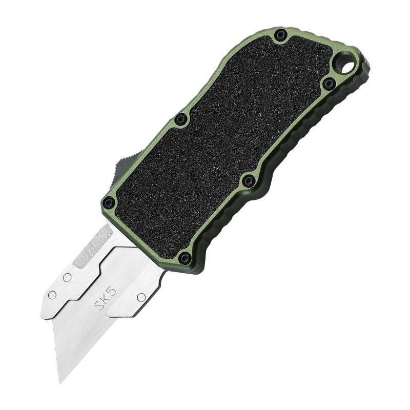 Description: This small Out The Front utility knife fits in a pocket, removes the replacement blade, and comes in a beautiful gift box. It has an excellent safety device to keep the blade from dropping in any situation, and the handle is made of carbon fiber material, making it smoother in the hand.