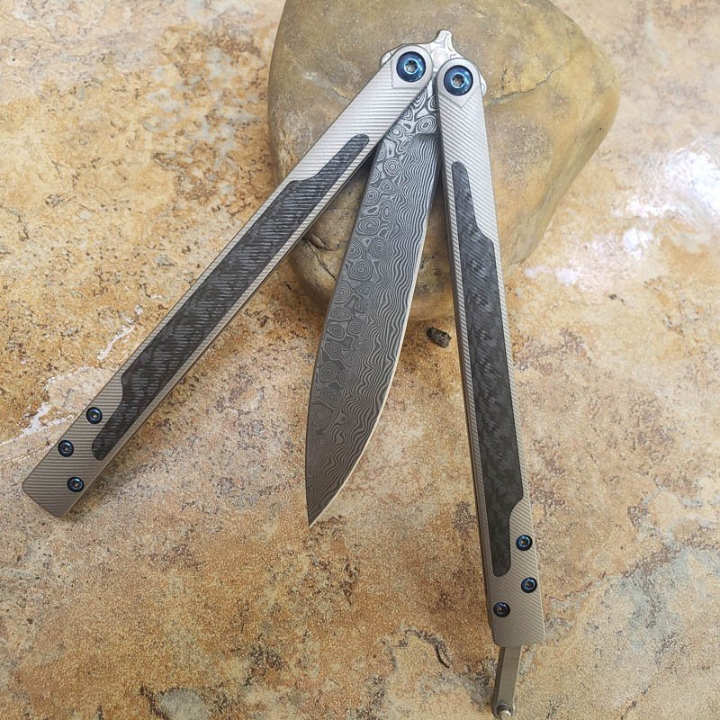 THEONE Titanium handle with carbon fiber inlay EX-10 Damascus butterfly slash knife